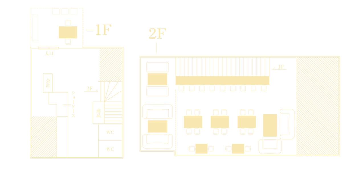 ヴィンテージ調の雑貨を散りばめた、まるで映画の世界のような店内には、カウンターとテーブル席をご用意しています。ランチやカフェタイムといった日常使いにもぜひ。